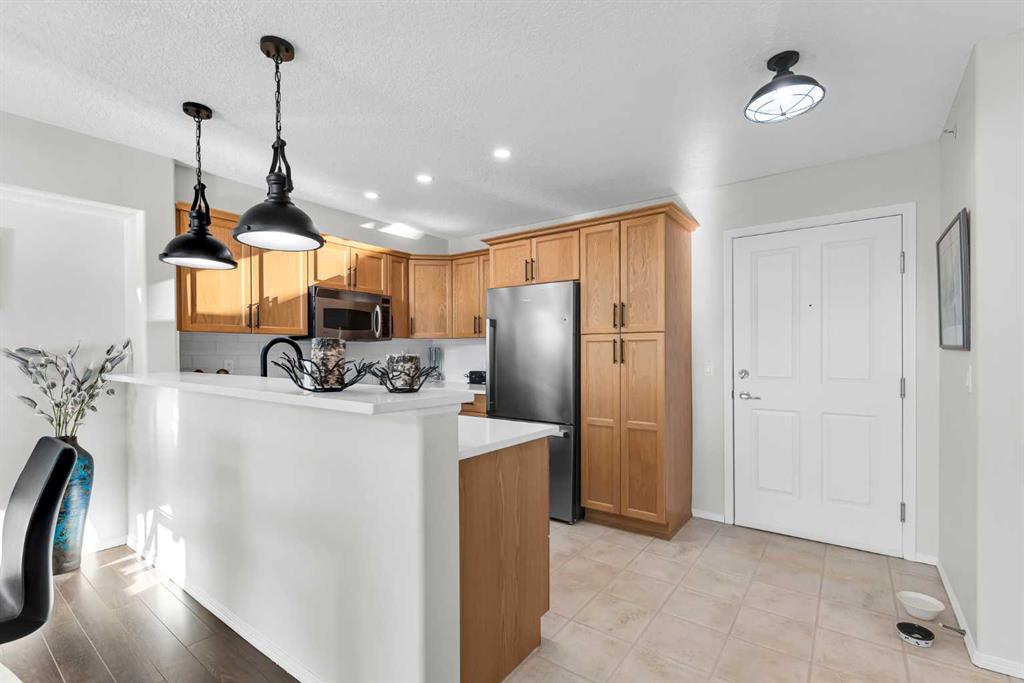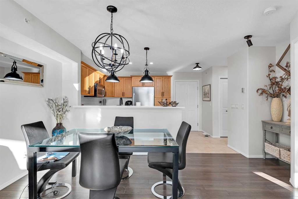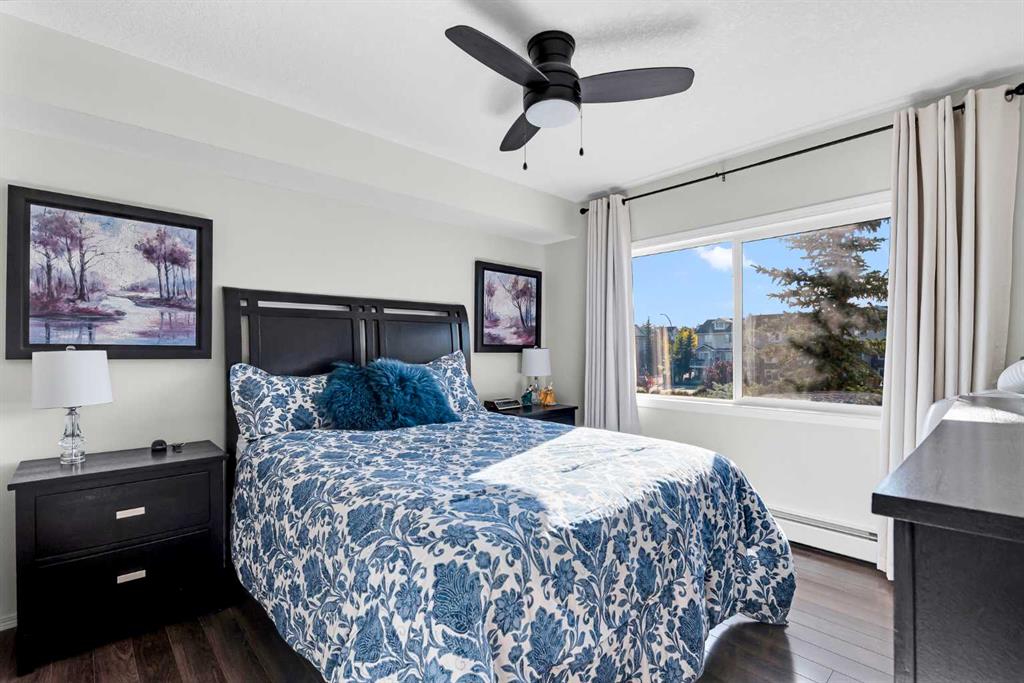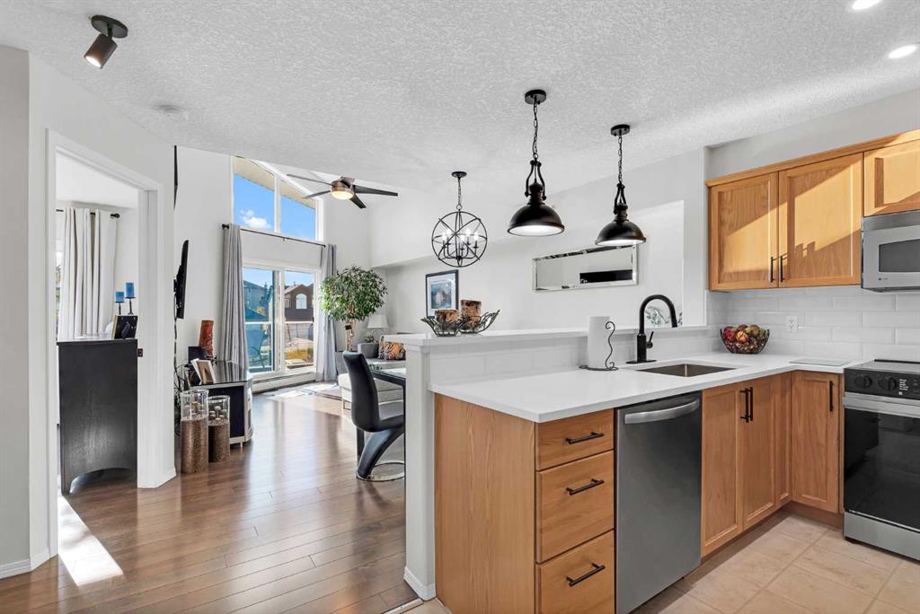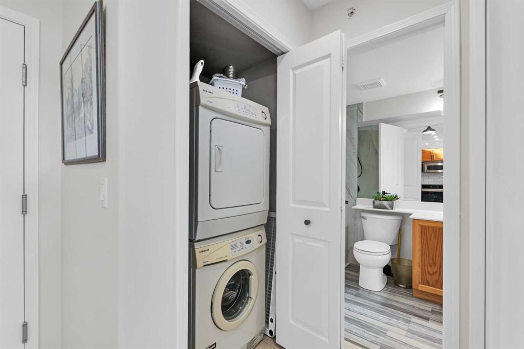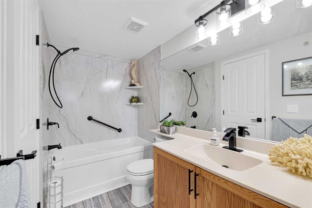 Discover the ultimate lakeside lifestyle in this beautifully renovated, top-floor one-bedroom, one-bathroom condo at the exclusive Bay Club Chestermere. With soaring 13-foot ceilings and large living room windows, this home is bathed in natural light, creating a bright and welcoming atmosphere. Enjoy a spacious layout, including a large deck with a gas BBQ hookup. The condo has been thoughtfully upgraded with modern finishes, featuring plank flooring in the living room and bedroom, fresh paint, textured ceilings, new light fixtures, fans, black hardware, and doorknobs. The kitchen dazzles with new stainless-steel appliances (stove, dishwasher, fridge), quartz countertops, a stylish backsplash, an apron-front single sink, and updated faucets and plumbing. The fully renovated bathroom includes a new bathtub and surround, modern faucets, and updated plumbing fixtures. Additional upgrades include new window screens, black curtain rods, and a new front door lock. Convenience is key with in-unit laundry (washer and dryer included), titled underground parking, and a spacious titled storage unit. Low condo fees grant access to amenities like a library/recreational room, mini gym, and exclusive private access to Chestermere Lake for Bay Club residents—perfect for water lovers. Located steps from shops, dining, and activities, this clean, quiet, and well-ventilated complex offers unmatched convenience. Don’t miss this rare chance to own a stunning lakeside retreat. Schedule your private viewing today! It’s a move you’ll be glad you made.